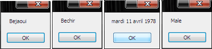 Text="First name: Bejaoui,last name: Bechir ,Birth day: 11/04/78 ,gender: Male"