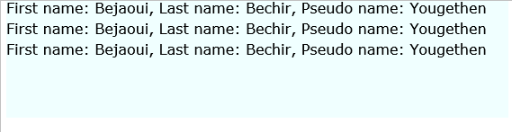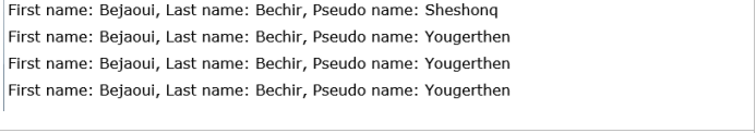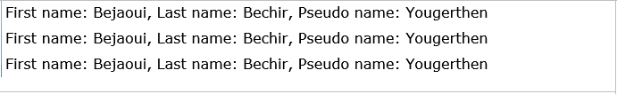 return string.Format("First name: {0}, Last name: {1}, Pseudo name: {2}",