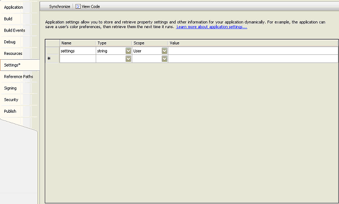 - Add connection name and set the type as connection string, the scope will be changed automatically to Application. Click on the "Value" corresponding cell and a small button will appear.