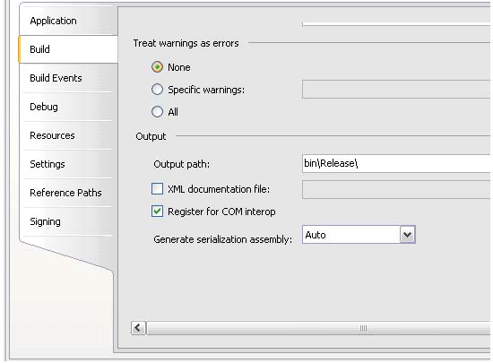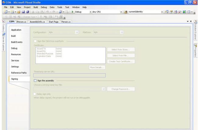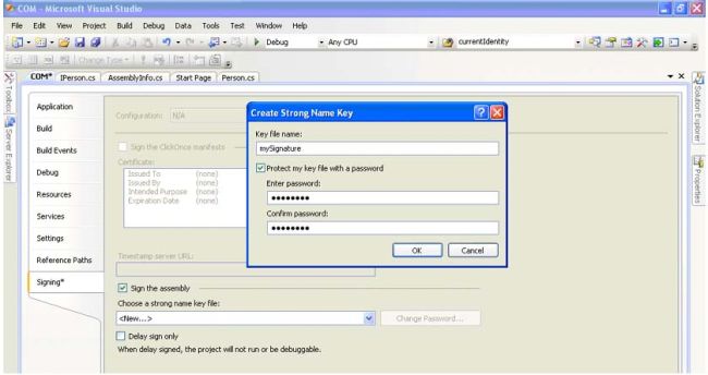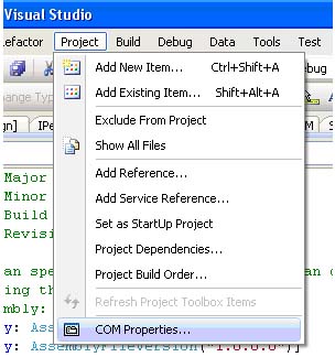 - In order to be exposed to COM, an assembly has to be strongly named. It means that it must be signed before. To sign the given assembly, go to Project menu> <Project name> property.