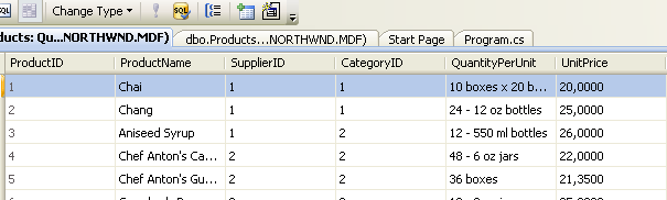 Let's switch to Visual Studio and perform the code that calls the above procedure. First, you derive a class from the DataContext in order to create some customized behaviors those fit our need.