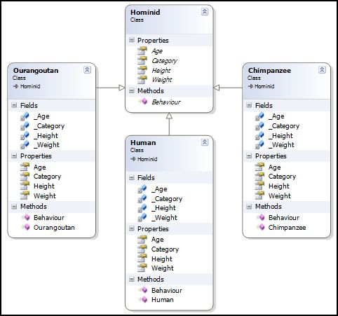 | public class Chimpanzee:Hominid     {         public Chimpanzee()             : base()         { }         private string _Category;         public override string Category         {             get             {                 return _Category;             }             set             {                 _Category = value;             }         }         private uint _Age;         public override uint Age         {             get             {                 return _Age;             }             set             {                 _Age = value;             }         }         private uint _Height;         public override uint Height         {             get             {                 return _Height;             }             set             {                 _Height = value;             }         }         private uint _Weight;         public override uint Weight         {             get             {                 return _Weight;             }             set             {                 _Weight = value;             }         }         public override void Behaviour()         {             Console.WriteLine("I'm a Chimpanzee");             Console.ReadKey(true);             Console.Beep();         }     } |