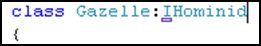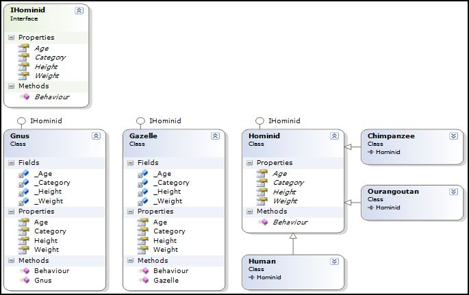 Interfaces come and put an end to this problem, by extracting the common characteristics of the both creatures' categories and serve as bridge between them. In fact, interfaces have more functions than this but let begin with this first utility. Ok, the question now is how to accomplish the task within Visual Studio when you have already developed the hominids family?