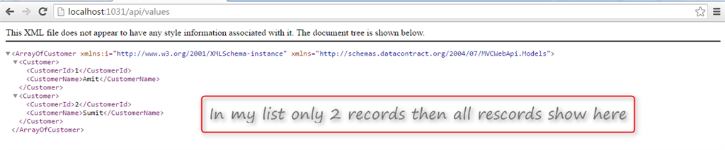 IEnumerable<Customer> Get() method. In this url I have not passed a particular customer id due to this reason it show all records of customer list.