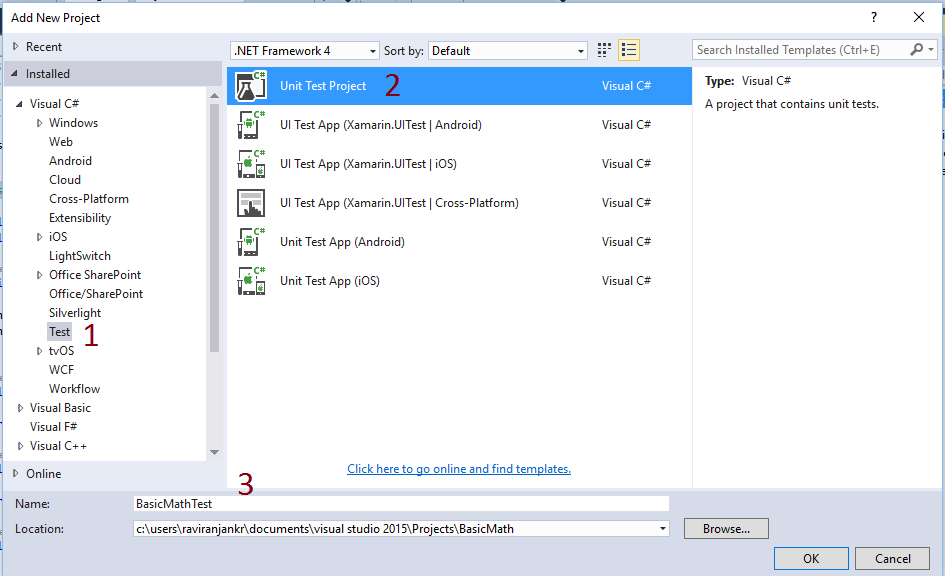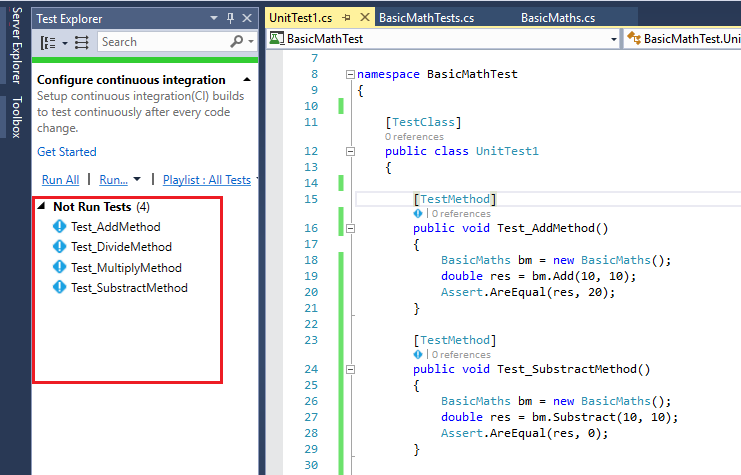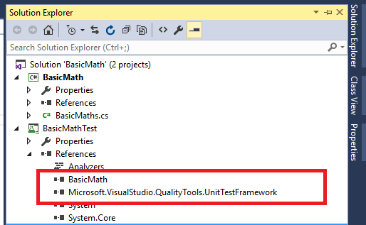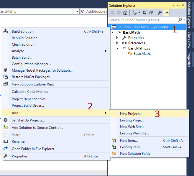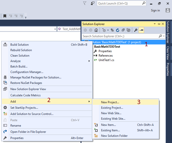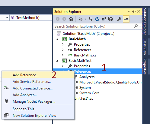To make MS Unit Test run, we need to create BasicMaths class and add reference to Unit Test project. Follow the steps given below to know how to create BasicMaths class and add reference to MS Unit Test Project.