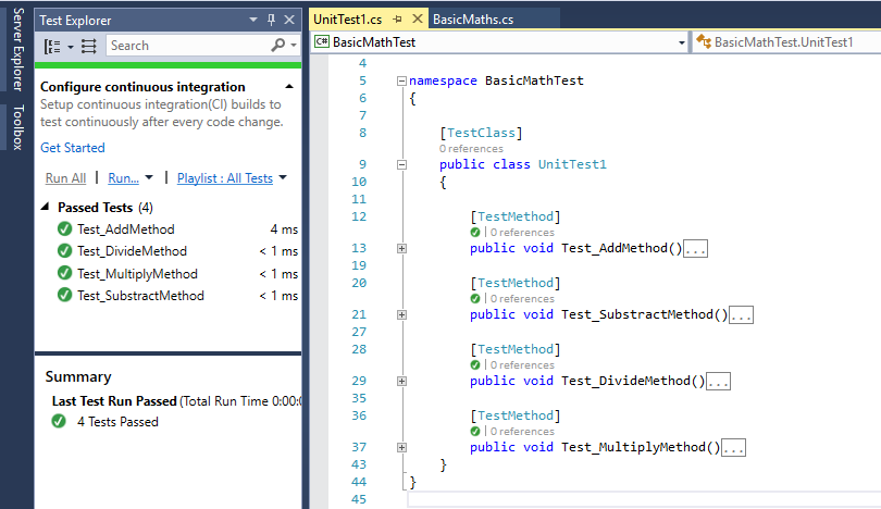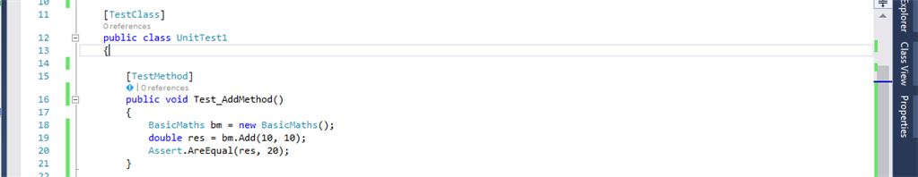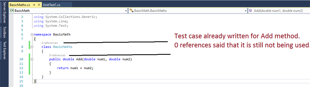 After writing the code, you can see that there are 0 references of BasicMaths class as well as Add method function but these functions are already being used in MS Unit Test project. To make it accessible, we need to add this project to MS Unit Test Project reference.