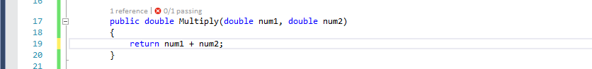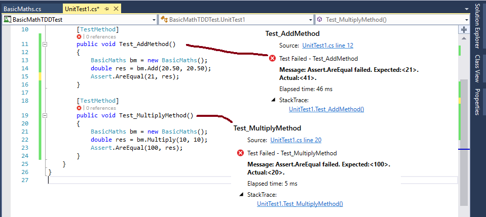 In Test_AddMethod Assert.AreEqual is supposed to give 41 as an actual value but we are expecting 21. It must be 41 to get Test passed. Of course after adding 20.50 and 20.50, we will get 41. Thus, we have written the wrong expected value. Change it to 41 instead of 21.