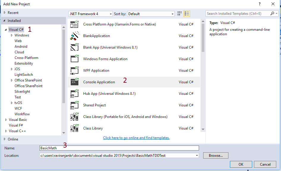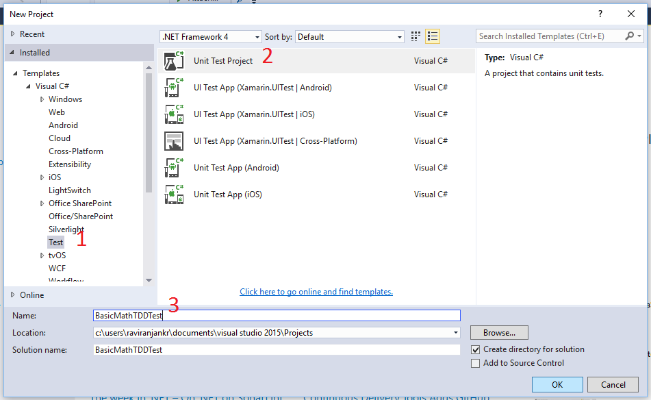 - Write Project name. Eg – BasicMathTDDTest followed by clicking OK button