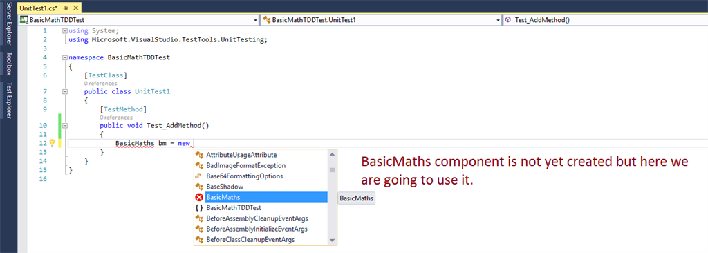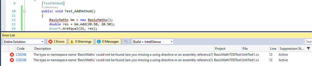 As you can see that there are two test methods- Test_AddMethod and Test_MultiplyMethod and both the methods are using BasicMaths class, Add and Multiply method, which are not yet defined. When we run this Application, you will get an error, as given below.