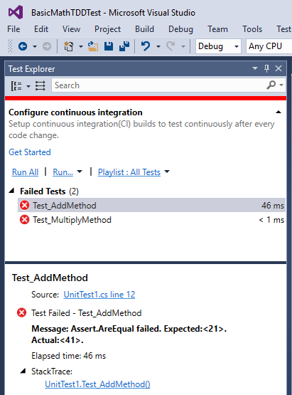 In this case, If the test fails; the test method is moved to the Failed Tests. group. Select the method in Test Explorer to view the details at the bottom of the Window.