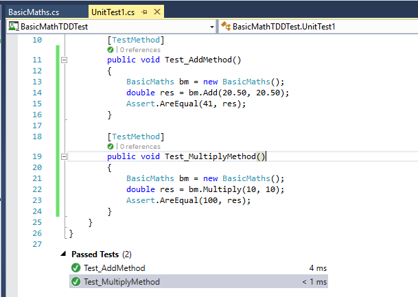 Now, write Add and Multiply Method under BasicMaths class for which we have already written MS Unit Test. The code will look, as shown below.