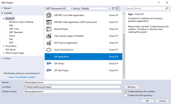 It will open a dialog box. Select Visual C# from the left menu and then select “Q# Application” from the installed template. Give your project a name and click OK.