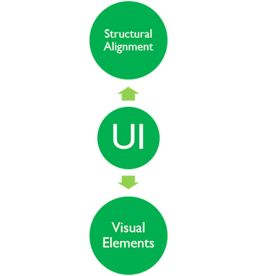 UI (User Interface) is focused more on how an application's elements are structured together; i.e., which button will display where, images will take how much space on page, where to display text, how to align spaces among different elements, which feature to place where on screen etc. UI also focuses on development of visual assets of the application that involve images, banners, ads, color scheme and consistent design of the application etc.