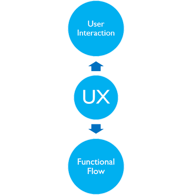UX (User Experience) is focused on human-computer interaction elements and overall functional flow of the application; i.e., whether to display a popup or a new page when user clicks a certain link or button, which page application will navigate to when a link or button is clicked etc.