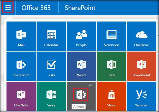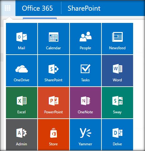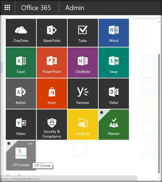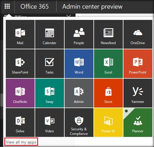 Office 365 provides an easy-to-access App Launcher menu from where we can select the frequently used apps. The common apps are shown below which include Outlook mail, Calendar, One Drive, SharePoint and so on. These are the apps listed out in the My Apps page of the Admin Center.
