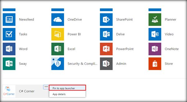 Clicking on it will navigate us to the URL attached to the tile which, in this case, is ‘c-sharpcorner.com’. In addition to the app launcher, we can pin the app to the navigation bar as well.