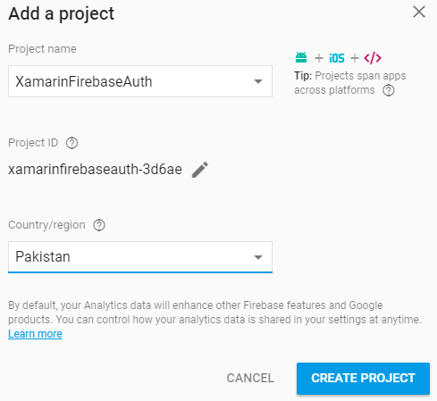 Open Firebase, go to the console and click on "Add Project". Enter the project name and country as shown below and then click on "Create Project".