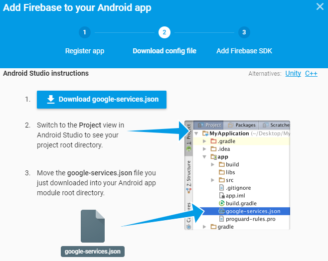 Now, download the google-services.json file and copy it to the app folder of your Android project.