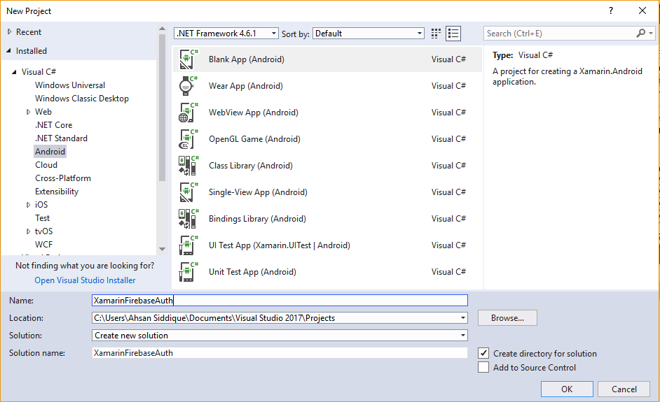 Open Visual Studio and go to New Project-> Templates-> Visual C#-> Android-> Blank app. Give it a name like XamarinFirebaseAuth.