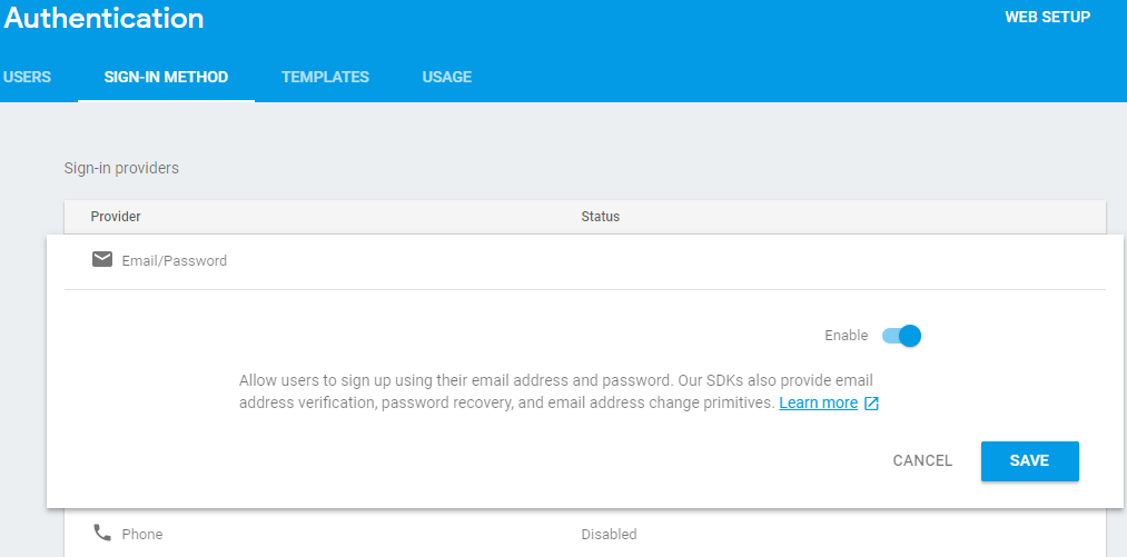 Go to Firebase Console, select your project, and click on "Authentication" tab. Click on Sign-in method, select Email/Password, and enable it.