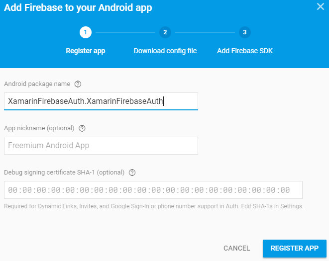 Now, click on ‘Add Firebase to your Android App’ and copy the package name of your app. All other fields are optional and can be left blank for now.
