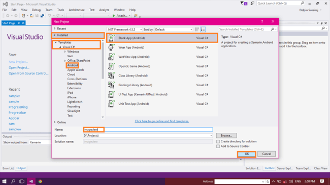 Step 2 - After opening the new project, select Installed --> Templates--> Visual C# --> Android--> choose Blank App (Android).