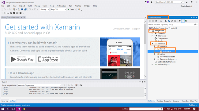 Step 3 - Next, go to the Solution Explorer and select Resource --> Layout. Double click to open the Main.axml page. You can either select Source or Design part for writing the XAML code or designing it using UI, respectively.
