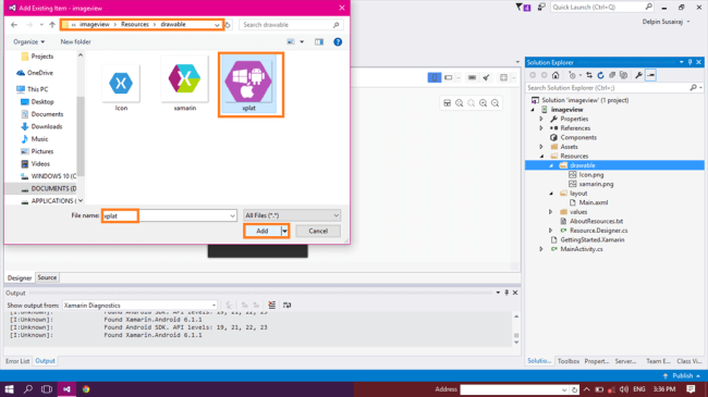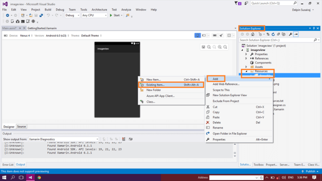 Step 8 - Next, add the image in your app. Go to the solution explorer, select Resource--> drawable. Right click --> add--> Existing Item.