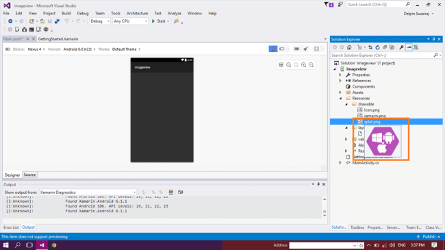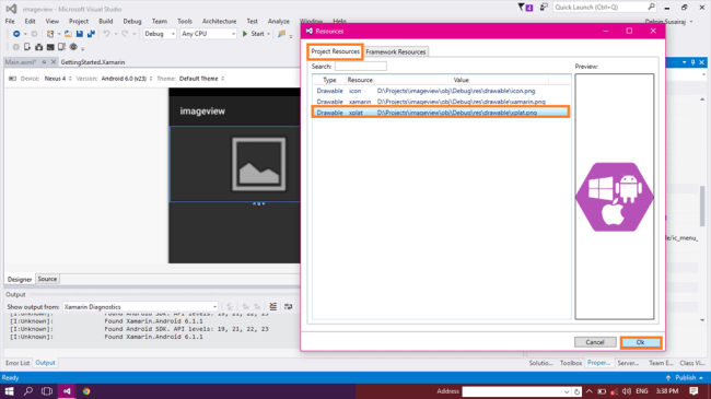 The following steps must be followed, in order to add the Image Control in Xamarin Android app, using Visual Studio 2015 Update 3.