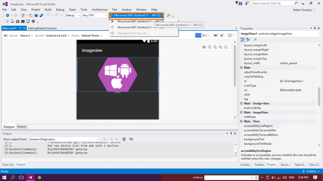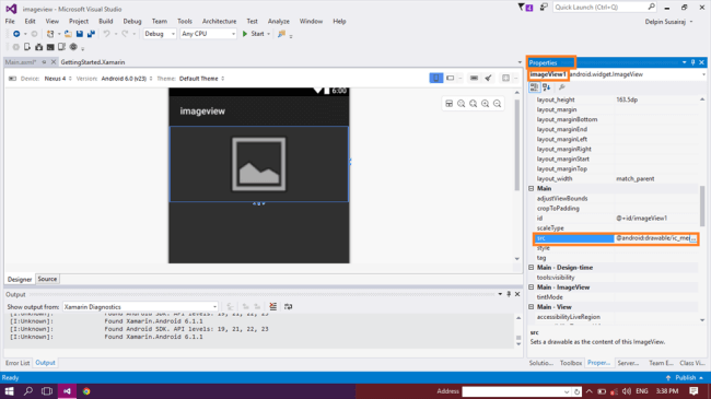 Go to the toolbox window. In the toolbox window are all tools and controls. You will select the image view and drag and drop the image view in your app main.axml page.