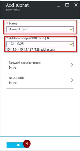 Provide a meaningful name and the address range for the subnet, as shown above and click OK button to create the subnet.
