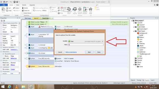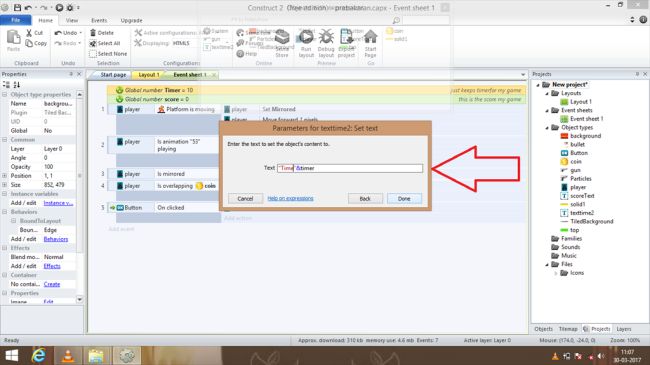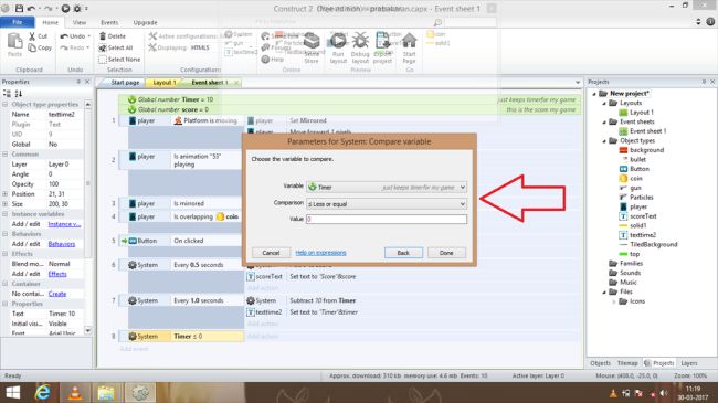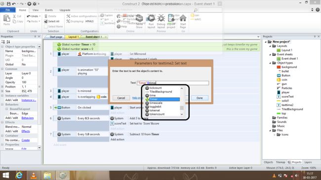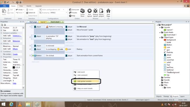 To create a global variable, right-click in event sheet & select Add global variables. Afterwards, we can see a new Window. To add a global variable, the Timer is assigned by the global variables.