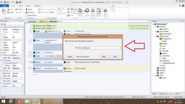 Now, we need to provide a new text name-> Score object in add global variable dialog box. By right clicking Window stage, we need to provide the requirements given below.