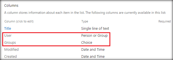 Add the below columns. Ensure creating ‘User’ and ‘Group’ columns as they will be used in the workflow.