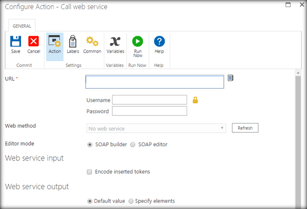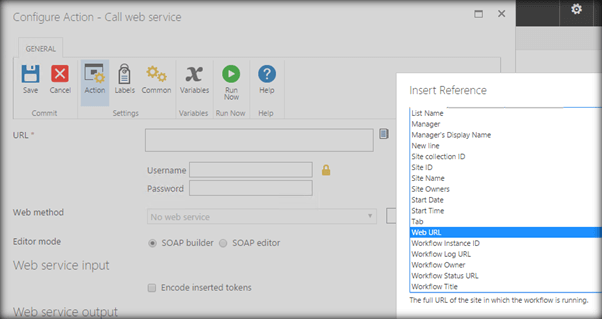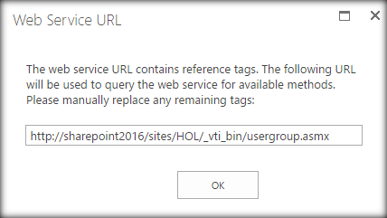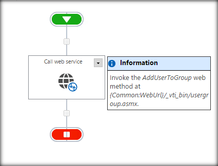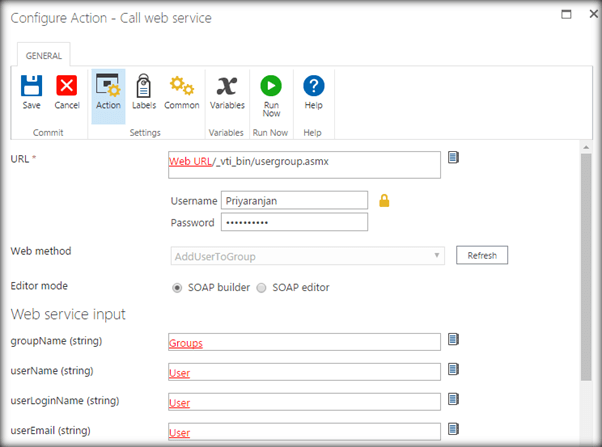 The web service URL will be created by fetching the Web URL from the workflow variable and appending “/_vti_bin/usergroup.asmx” to it.