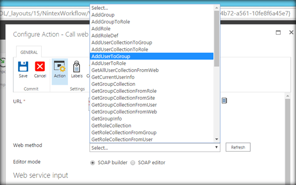 Now, we have to mention the web method which is ‘AdduserToGroup’ in our case.