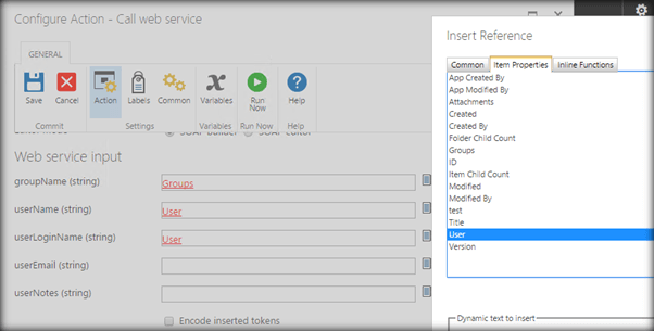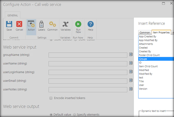 We have to assign a couple of other parameters which will be used by the web service. In order to do that, fetch the values from the SharePoint List so that it can be assigned dynamically during run time. Click the browse button, next to groupName field, and select the list item field ‘Groups’ from Item Properties tab.