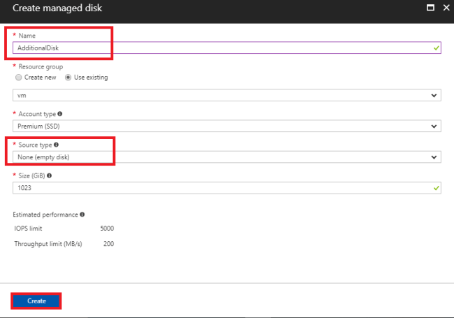Then, it opens the "Create managed disk" blade. Enter the name of your disk and configure the settings as per your wish and enter the volume for the drive you want in the Size field. The source should be empty, and press Create.
