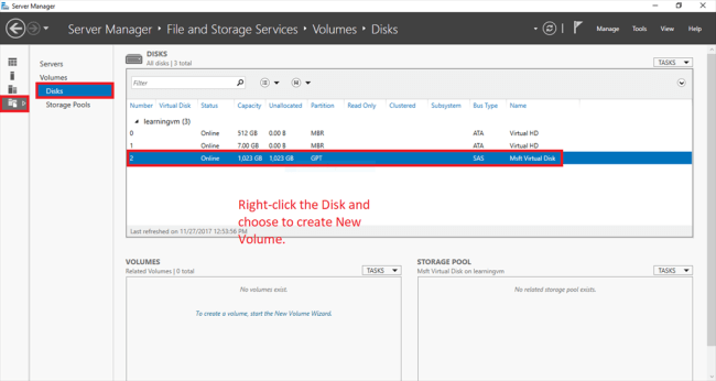 For Server Machine, in the search bar, type "Server Manager" and press Enter to open it. In the File and Storage Explorer, under the disks, our disk is attached and not initialized until we create the partition. Right-click on your disk and choose "New Volume" to create a volume.