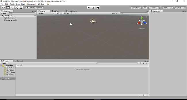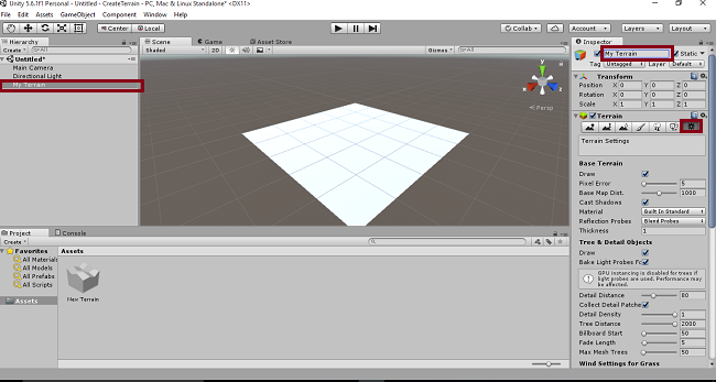 The terrain object will be display in the scene view. The name is displayed in the hierarchy view. Terrain assets display in the assets view.