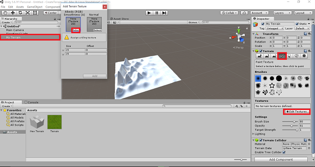 The Terrain images can be added into the Assets. Then, Click on the My terrain, choose the brush tool on your right side. Click on the edit textures, select add texture. Click to select the Add Terrain Texture window.