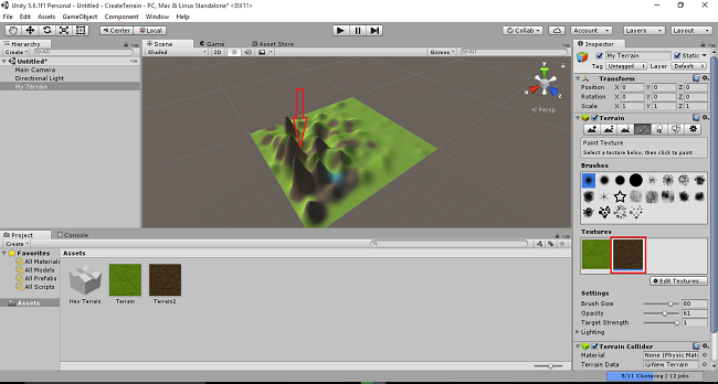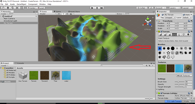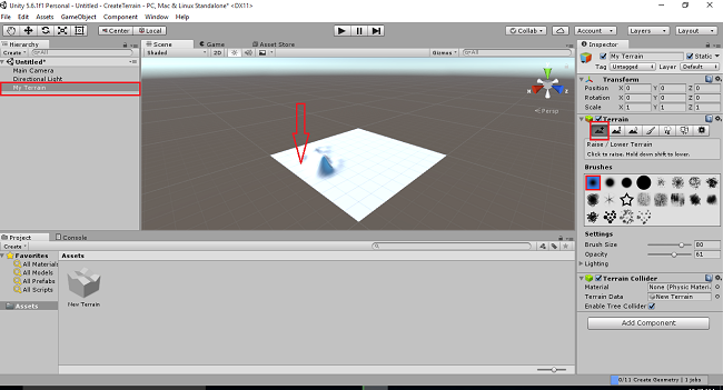 Scroll your mouse to decrease the view. Click on the My terrain in your left side. Choose the Terrain tool for red marked tool. Choose the brush and increase the brush size you want. And draw the Terrain using a brush like this,