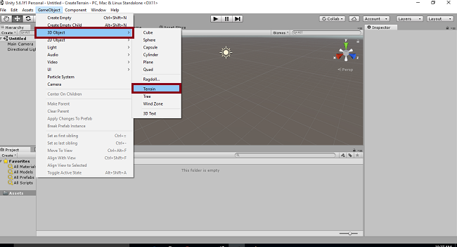 Select the GameObject menu in menu bar. Select 3D object and pick the Terrain option.