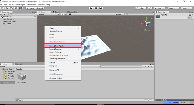 Right click on the assets. Click Import new Assets. Select Terrain2 image and Click on the Import button.