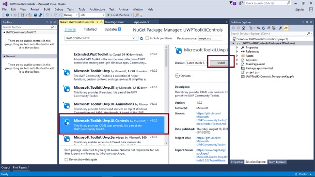 Choose Browse and search Microsoft.Toolkit.Uwp.UI.Controls, select the package and install it.