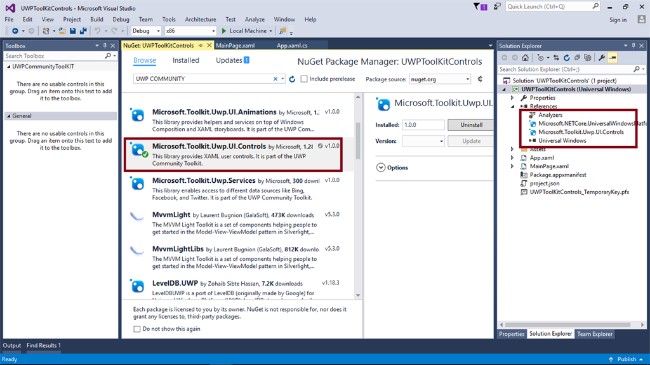 Step 2 - Open (double click) the file MainPage.xaml in the Solution Explorer and add the Microsoft.Toolkit.Uwp.UI.Controls reference in the project.