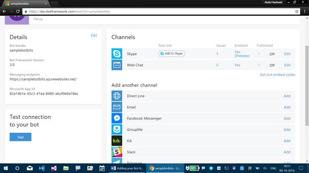 Here goes your Bot Application, which is added for Skype channel.