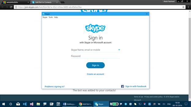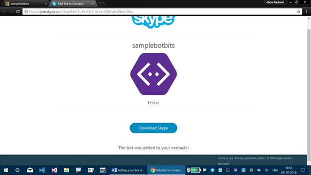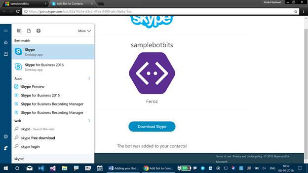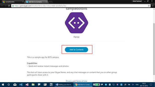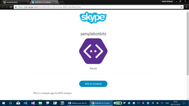 Step 2 - It lets you add Bot Application for Skype. Click “Add to Skype” here.