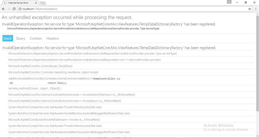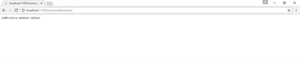 Now, browse the Addmvc action and you will get an error page. If you want to use MVC features, then you have to use the AddMvc method instead of AddMvcCore.
