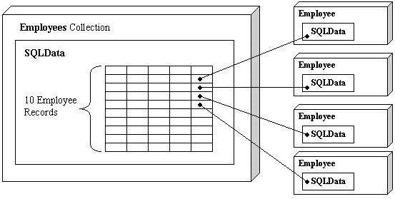 An illustration here might prove useful. The Employees collection in Figure 3 contains ten employee records. Each Employee object is using its SQLData struct as a bookmark into the collection. This differs from the previous code sample, in which an individual Employee object was created. In that case, the Employee objects SQLData actually contained the data rather than acting as a bookmark into a collection. The SQLData struct hides all of this from the developer.